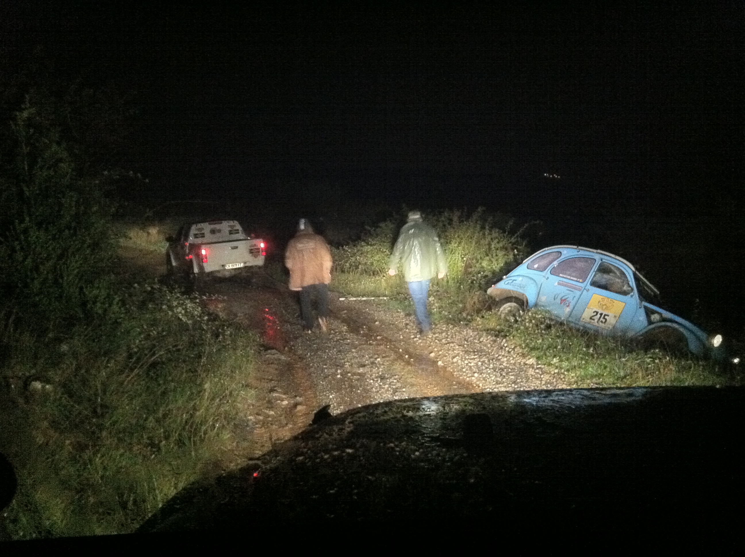 After dinner, as we were getting ready to pitch our tent under the shelter of the shepherd’s cabin, we lent a hand to one of the participants who came to ask for help when his Deux Chevaux ended up in the ditch after he missed the turn to the field where we were camping.