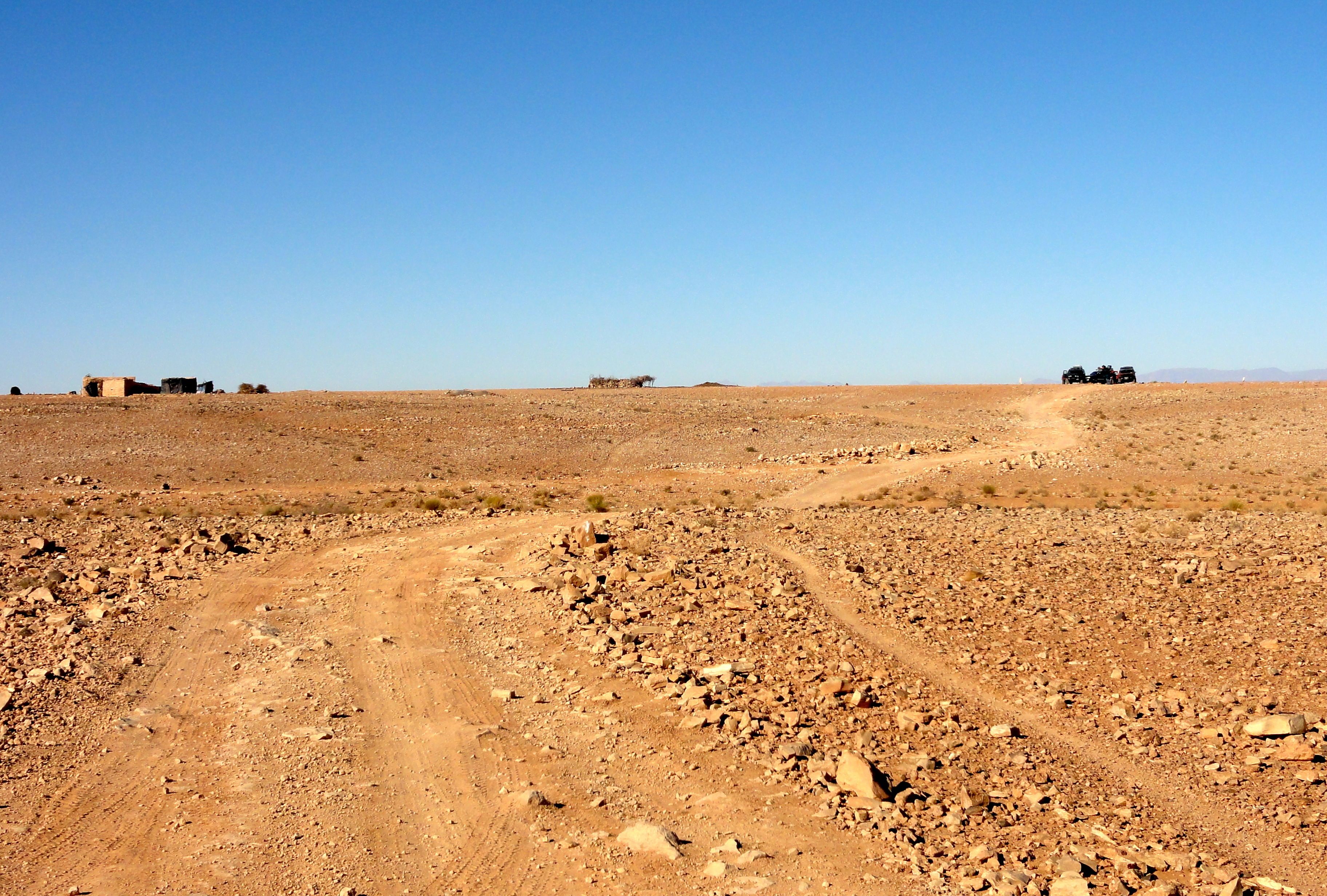 Two years before, the Foum had been a dry, barren plain where the track had been fast as long as you kept a lookout out for the larger bumps and ruts. This year, we had to make our way more carefully. We were amazed to see a few worked patches of soil that soon gave way to field after field, freshly tilled and ready for sowing wheat. The dry barren plain had been transformed by the rain into fertile farmland! We drove west toward Zagora, continuing on the narrow piste that at times closely hugged the base of the mountains to avoid ravaging the carefully prepared fields.