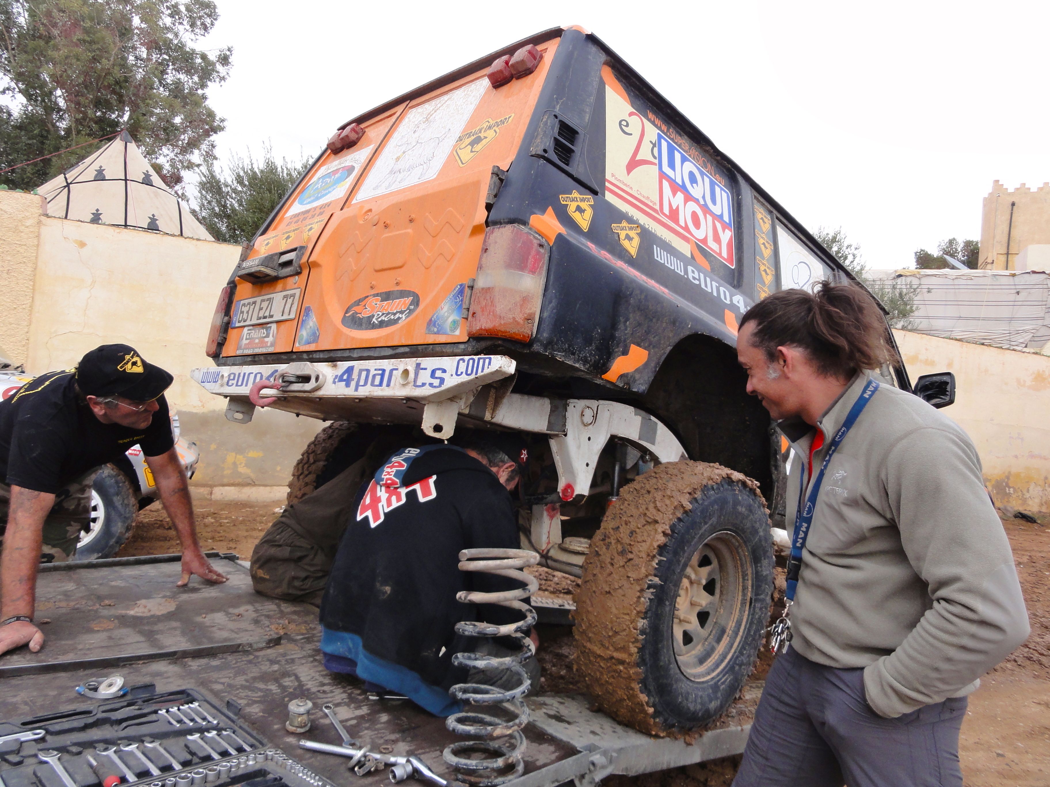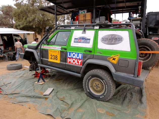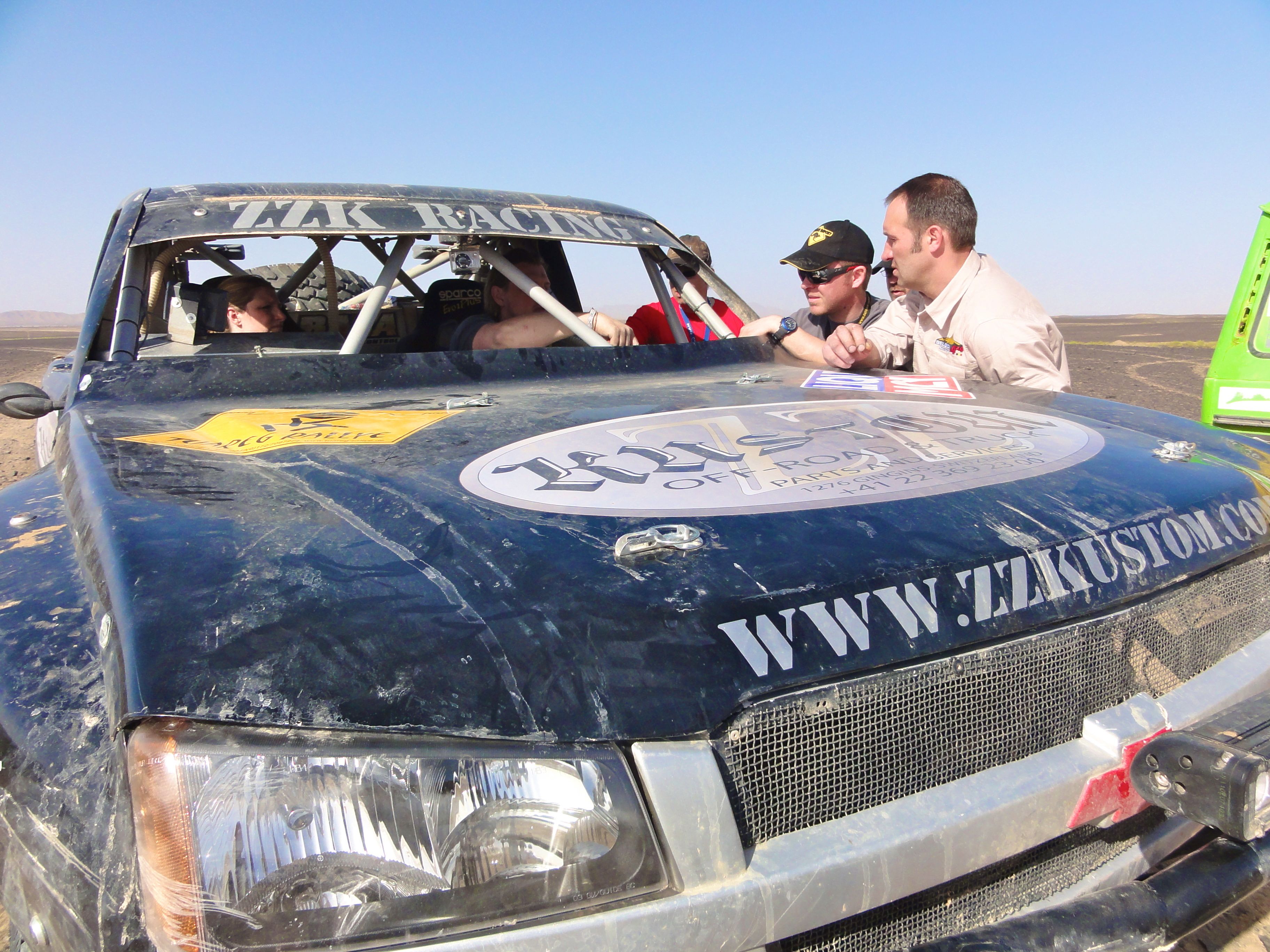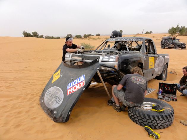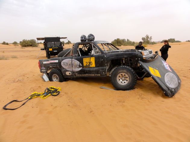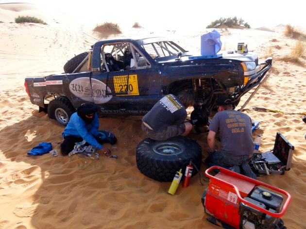Unfortunately, we didn’t get to stay to see any of our other racers; Stéphane and Caro were on the way down the dunes but were having trouble with the wheel bearings again and needed assistance. We had to go back to camp and get the MAN KAT. We’d drive it at close as possible to their position, and then go to meet them with the JK Rubicon.