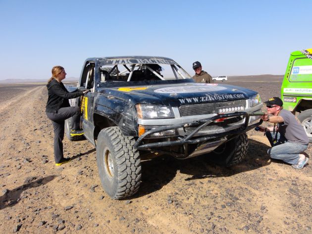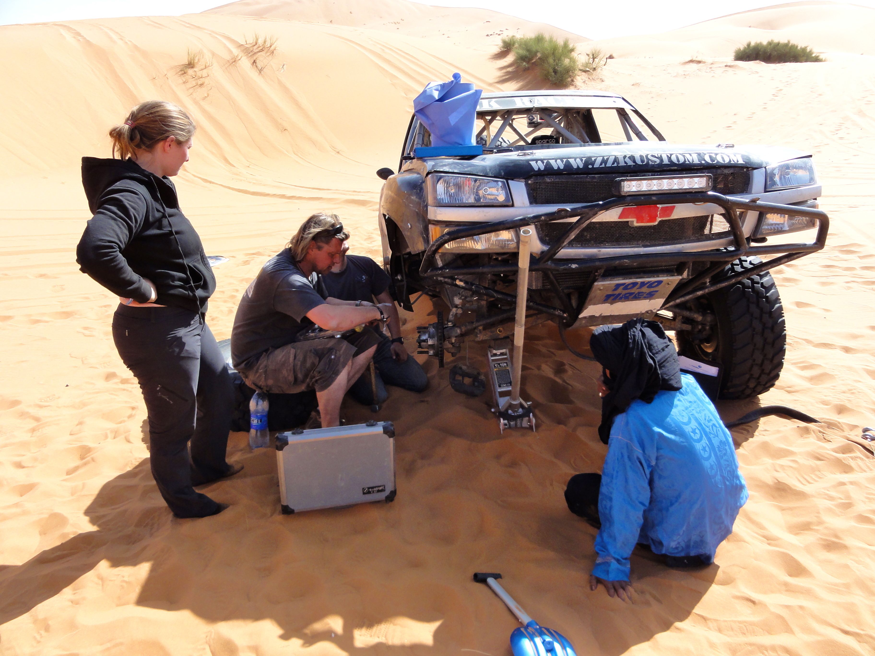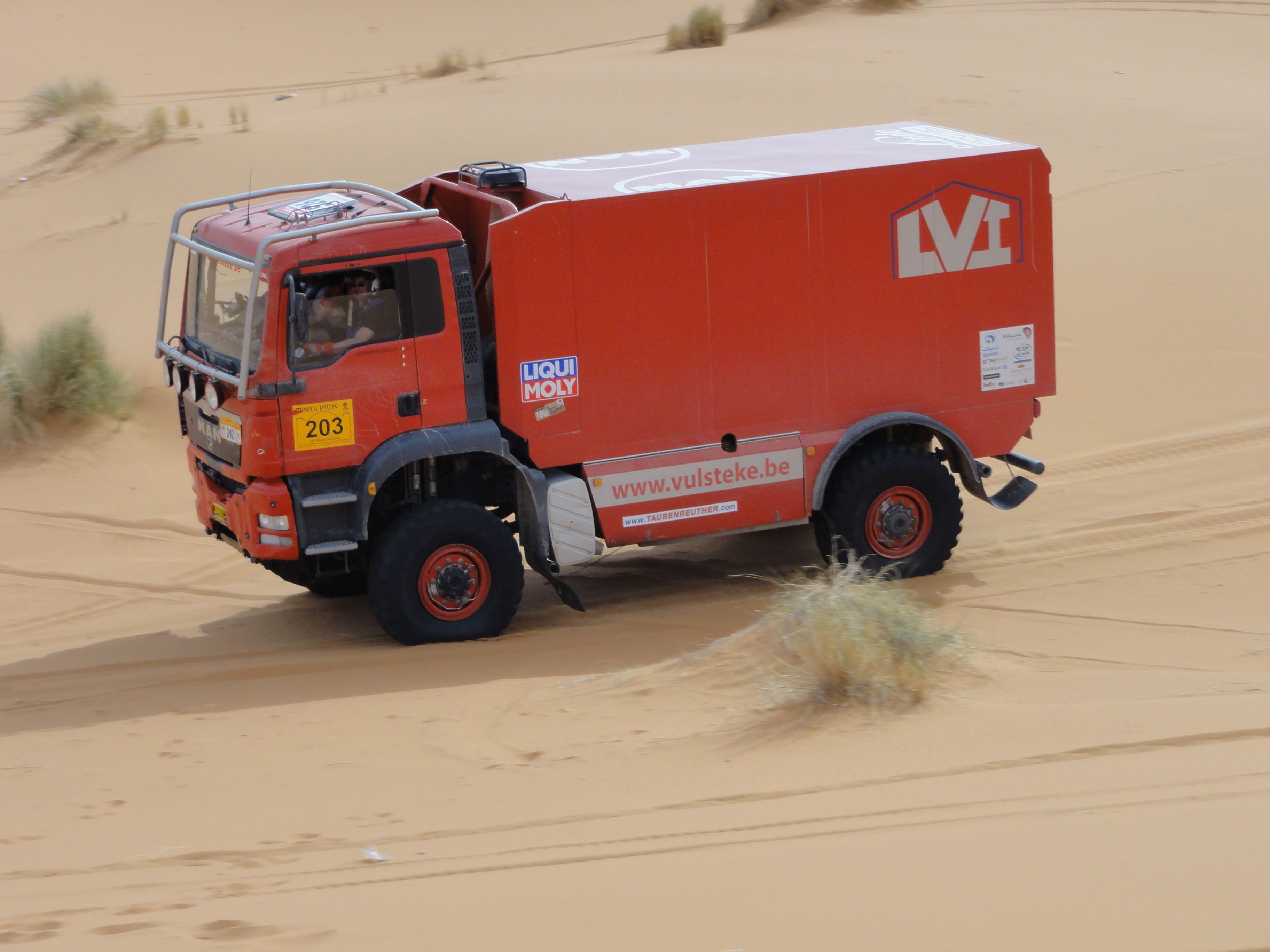Unfortunately, we didn’t get to stay to see any of our other racers; Stéphane and Caro were on the way down the dunes but were having trouble with the wheel bearings again and needed assistance. We had to go back to camp and get the MAN KAT. We’d drive it at close as possible to their position, and then go to meet them with the JK Rubicon.