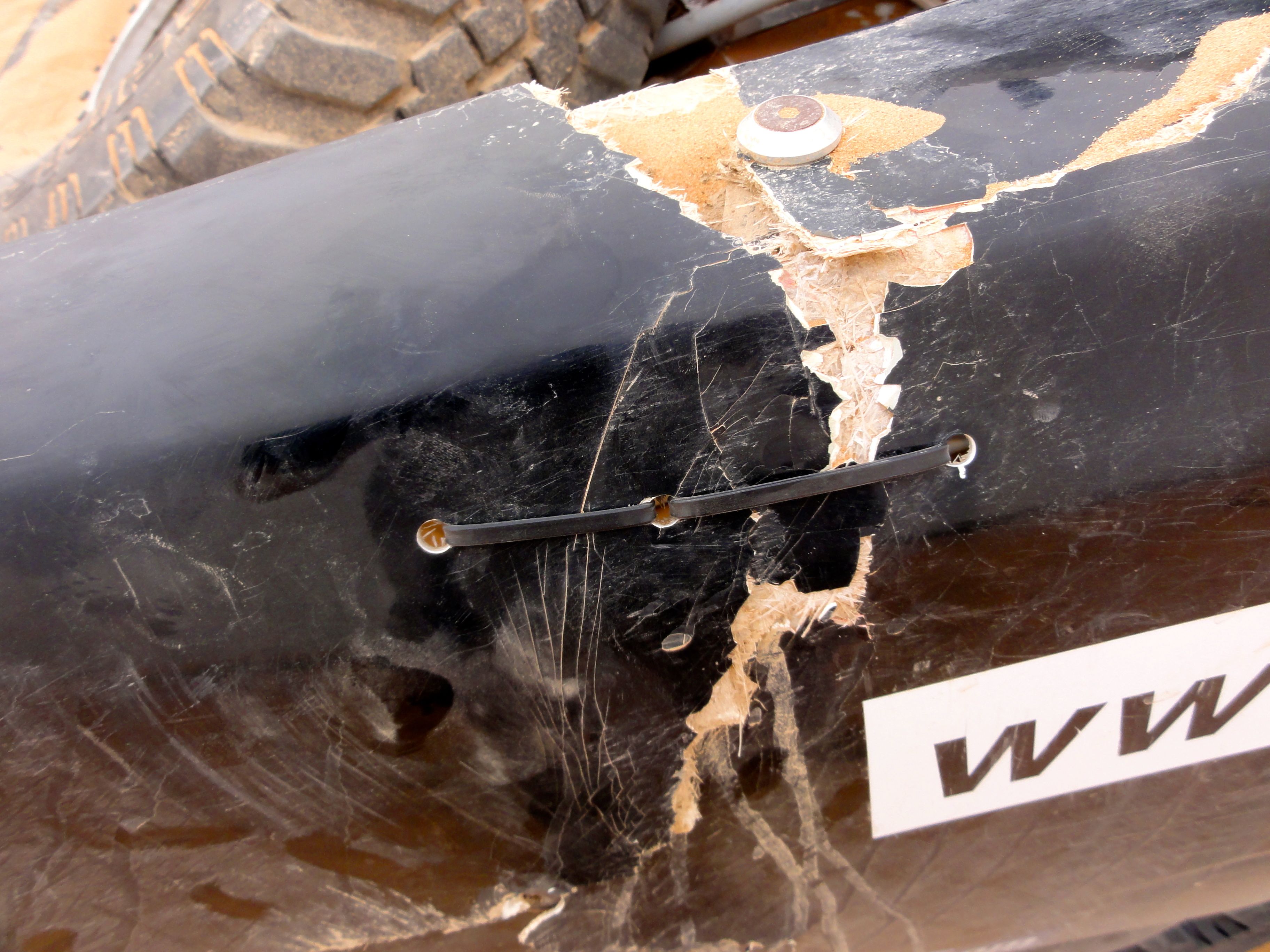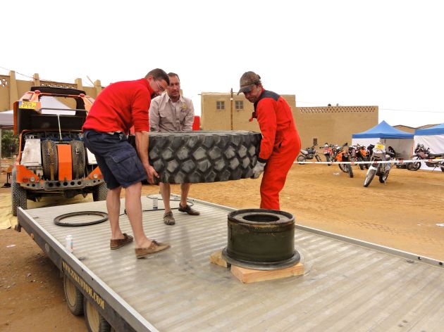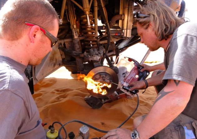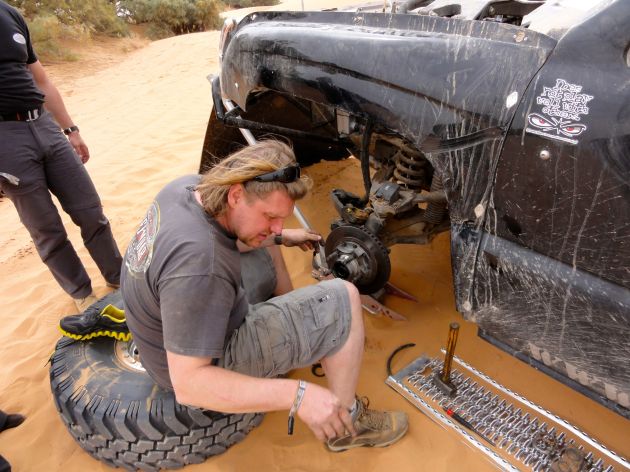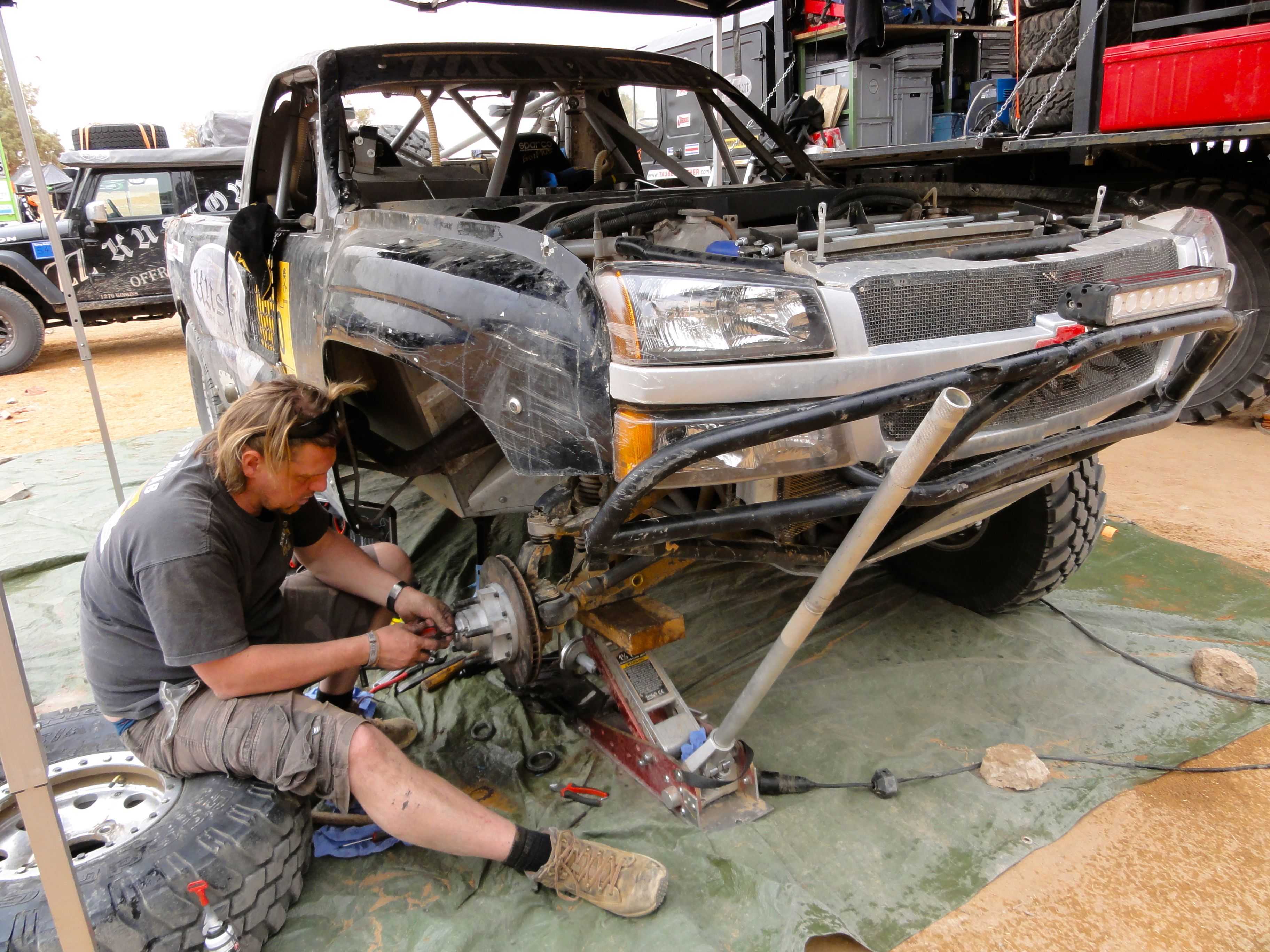 Within a few hours, they had the Protruck ready to drive out of the dunes, but it wouldn’t be possible to resume the race again until the cause of the problem had been addressed. Without a way to keep sand and gravel from getting into the bearings in the first place, Stéphane and Caro would have the same problem every day. Since they didn’t have the original part, Stéphane and Edouard didn’t have much choice except to make a cover to seal the bearing. If the work wasn’t finished in time to start the race tomorrow, the team would take a penalty for missing the day.