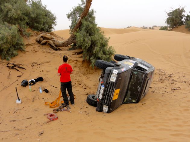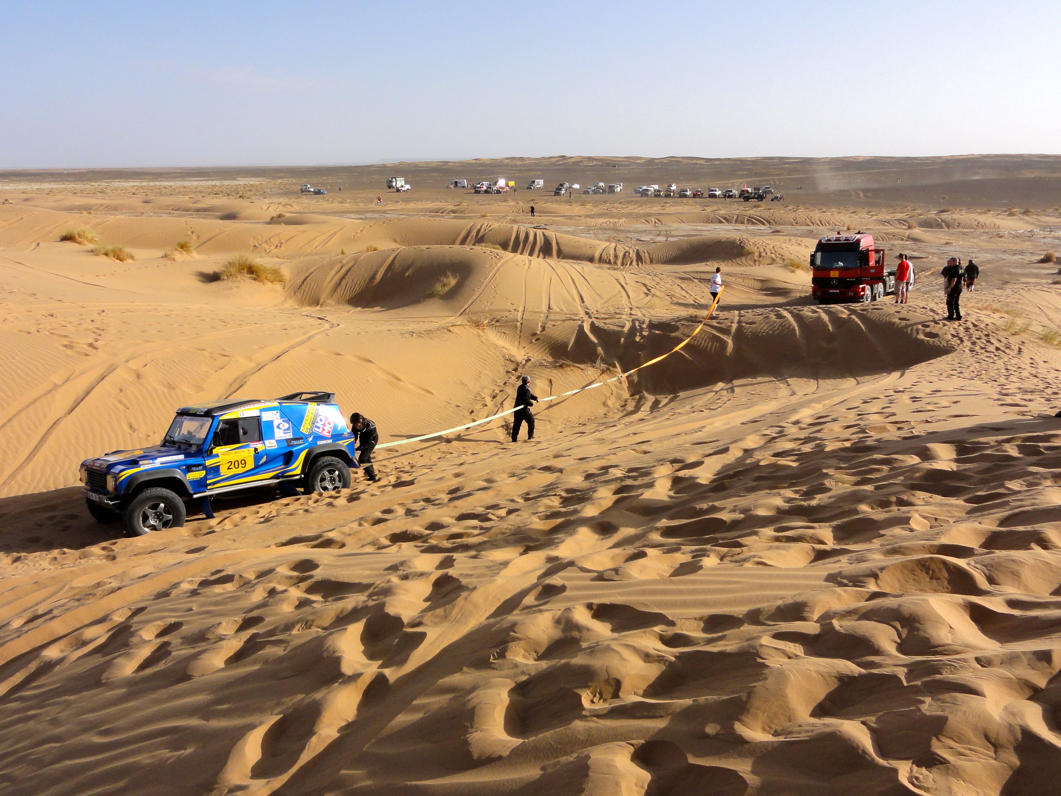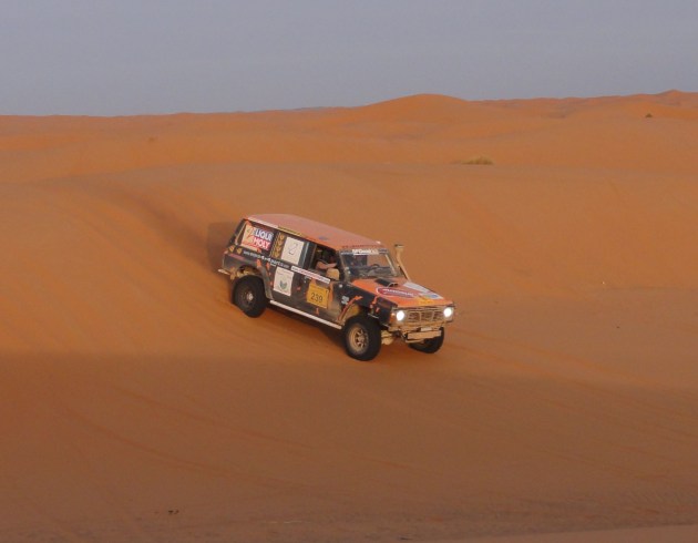 Florian and Yvan had also gotten off to a slow start after having been squeezed into a difficult trajectory by two cars who closed in on either side. As a result, they were stuck in the sand out of sight behind a dune, and we didn’t realize it until several minutes later when they’d dug out the car and got back on the way. Suddenly, they were coming out from behind a dune and then heading off surely into the horizon where the others had disappeared a short time ago.