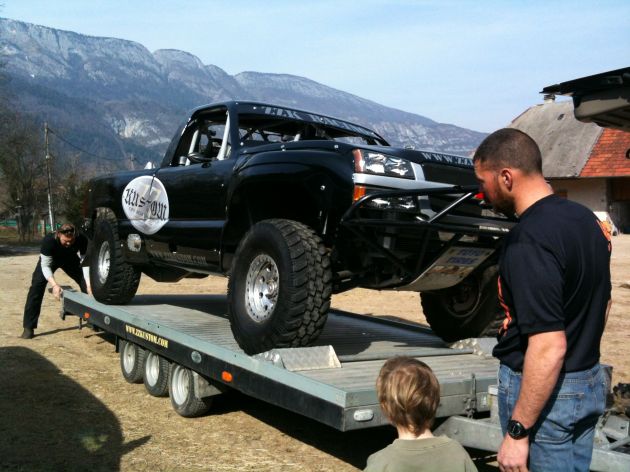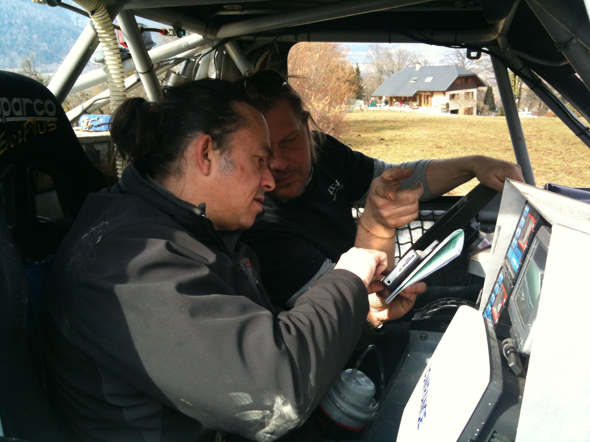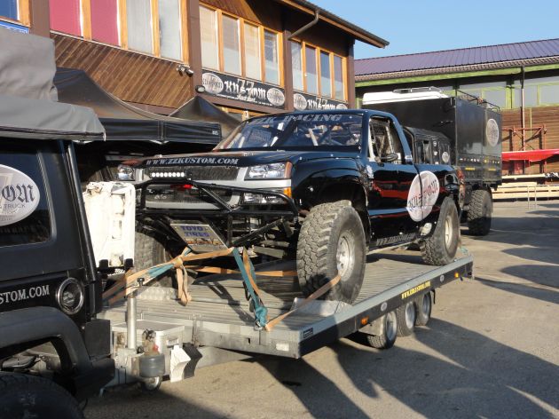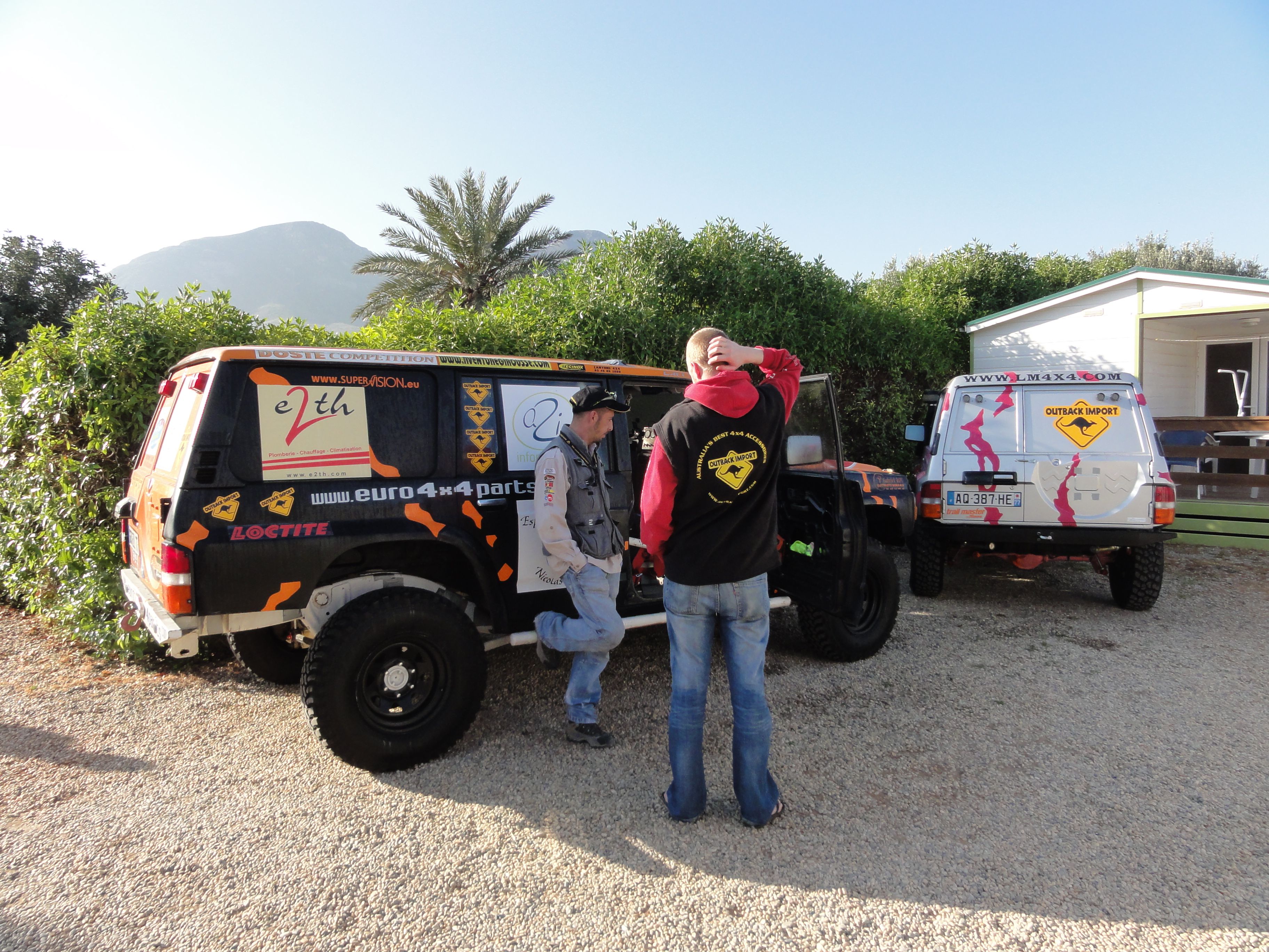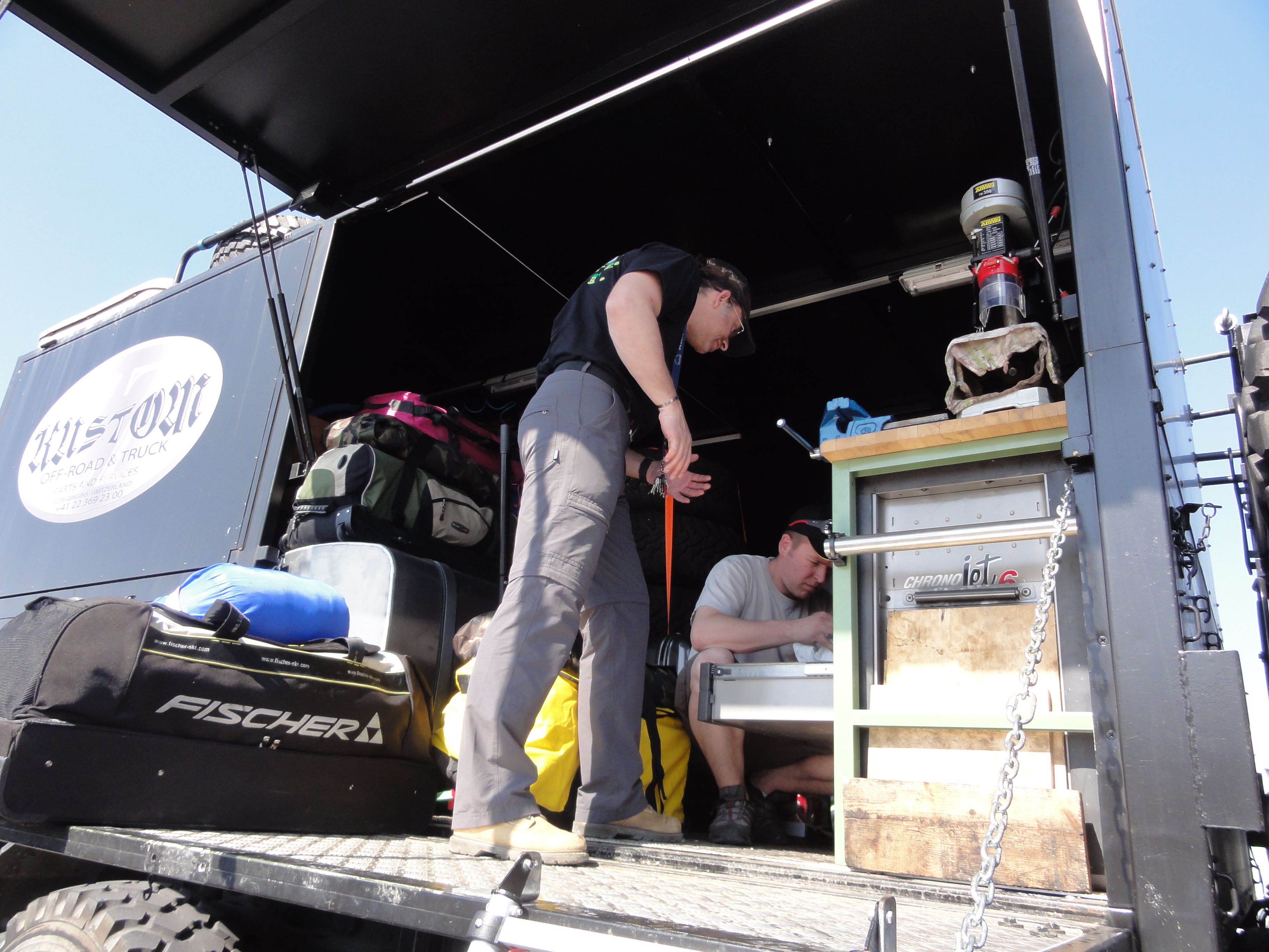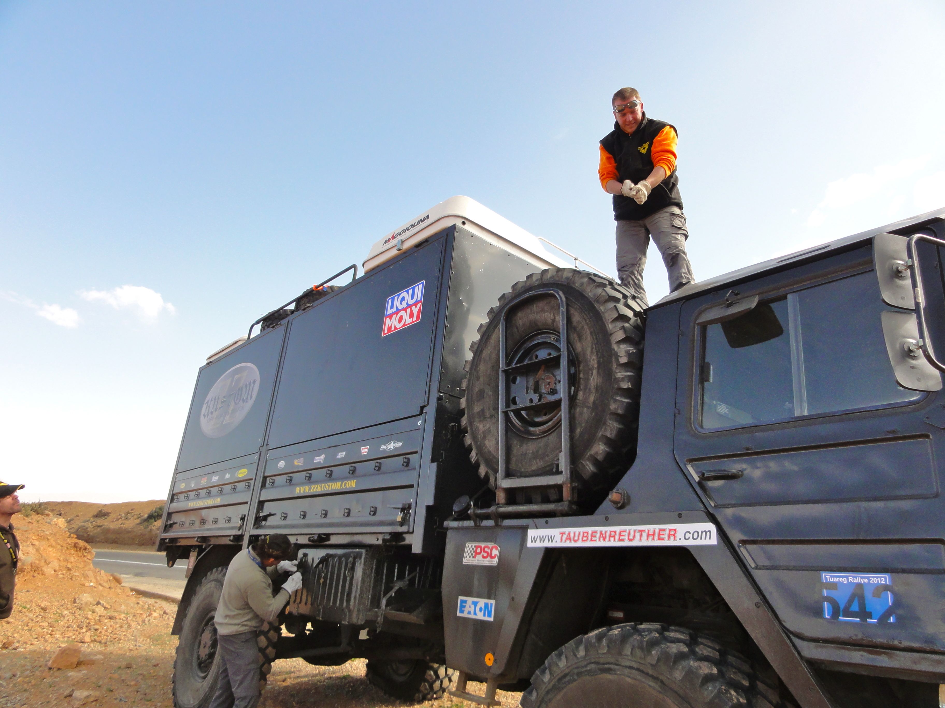 Just at that moment, we received a call from Caro. She and Stéphane had run off the track, and the steering had been damaged. They needed assistance between the first and second stages of the Special. The timing couldn’t have been worse. We were just at the place where the race and service routes were the farthest apart and wouldn’t be able to get to the service point before over an hour, even if we hadn’t been immobilized. Edouard couldn’t go alone in the JK, because he needed the tools and equipment from the workshop on the MAN, so we had no choice. Stéphane and Caroline would have to wait. Fortunately, it was still possible for them to continue the race with the Protruck, so Stéphane kept going and would advise us when they reached the next service point.
