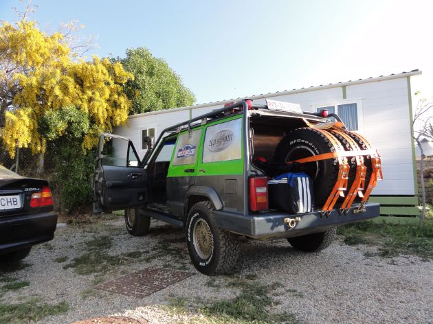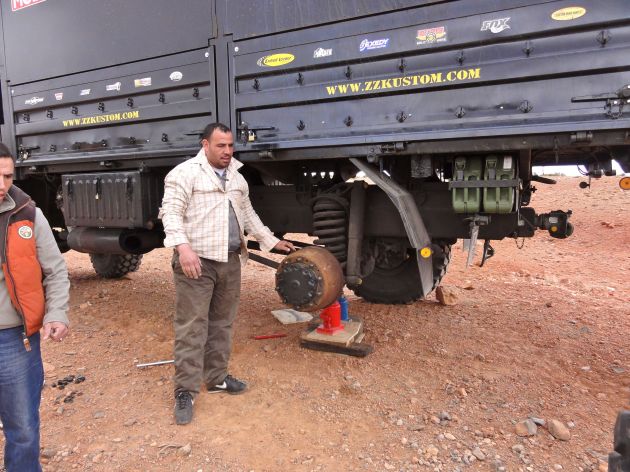 On our side, there was lots of traffic on the road, but very few heavy trucks likely to have a hydraulic jack that could lift enough to help us. After about 15-20 minutes, a Moroccan truck driver passed and then stopped 100m down the road, made a U-turn and parked on the other side of the road. We ran over to meet him and asked if he had a jack. He did, and he was happy to help us. He and his co-driver had more experience than we did with this situation, and we appreciated their assistance. Once they arrived, we quickly got the tire changed and could get back on our way. It’s a shame that not everyone here is as nice as these guys were. We offered them something for stopping to help us, but they didn’t want to take it, they were just happy that we were able to get back on the road to the Rally. These are the kind of people that make the world a better place.