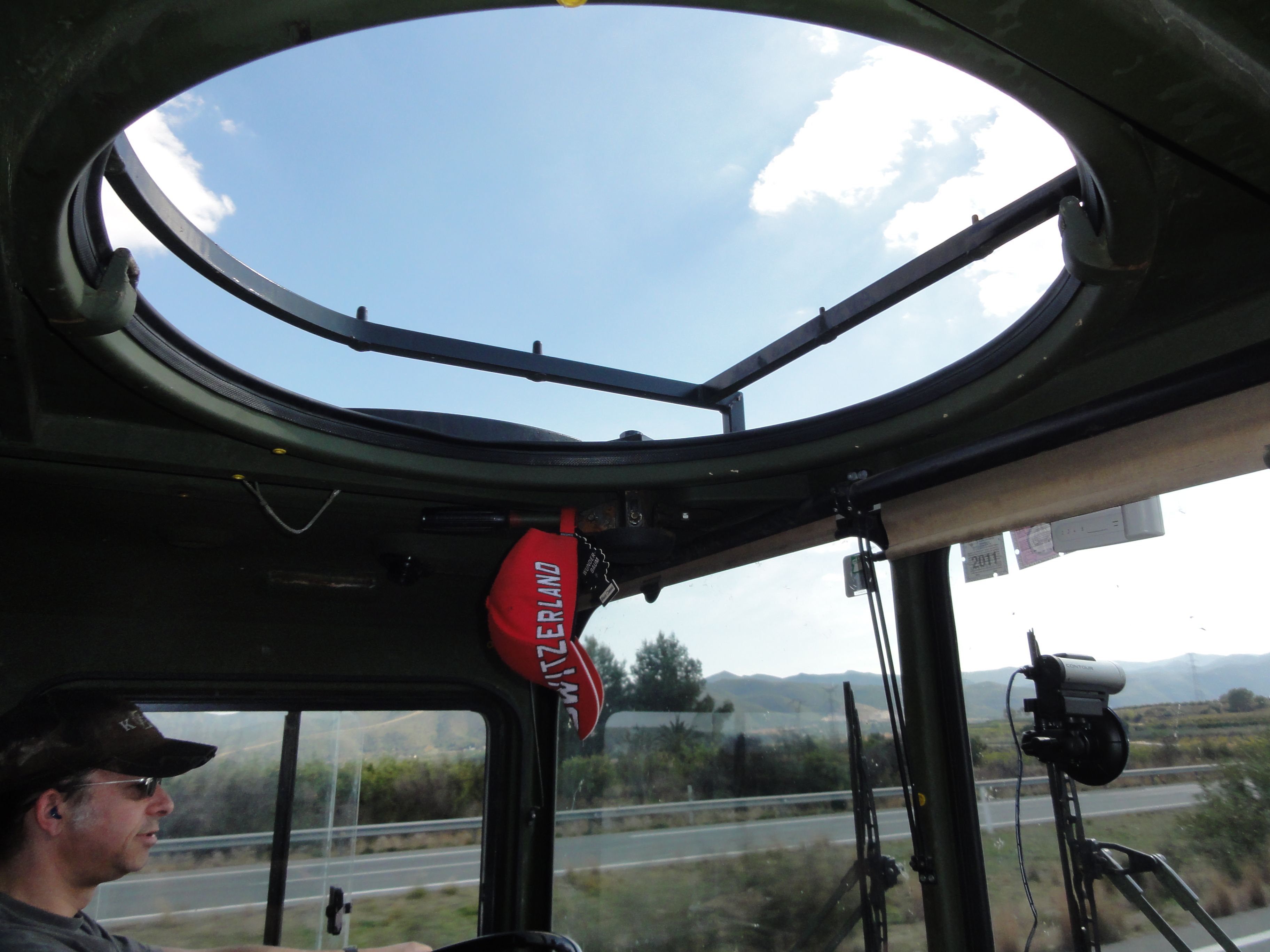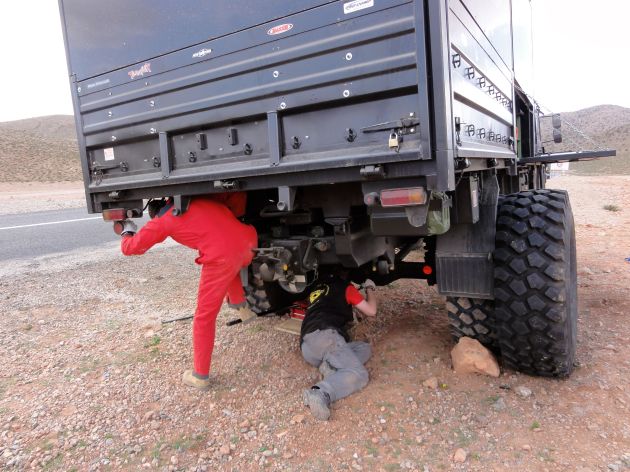 Heading south from Midelt, we had a tire blow out on the road to Er Rachidia. We’d become used to the truck’s inertia, which tends to pull it from side to side on winding roads and when passing trucks, because of the change in air pressure. There’s no sway bar on the rear of the truck, so this phenomena can be quite important due to the high center of gravity. When the road is rough, the reaction can be dramatic, so at first we didn’t realize what had happened. We were on a curvy road, going downhill toward a bridge, when the truck pulled suddenly to the left side, and Christophe had to react quickly to keep control. He managed to countersteer to keep us from veering off the road (or tipping over), but it was close! Soon we heard Edouard’s voice on the radio letting us know that our left rear tire had blown out, and we’d have to pull over to change it. He later told us that the right wheel had been lifted completely off the ground when the truck lurched to the side.